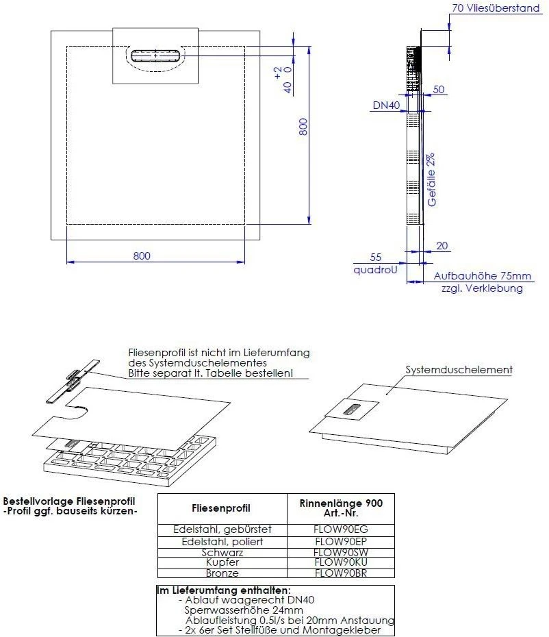 - integriertes Ablaufgehäuse aus ABS mit Geruchsverschluss